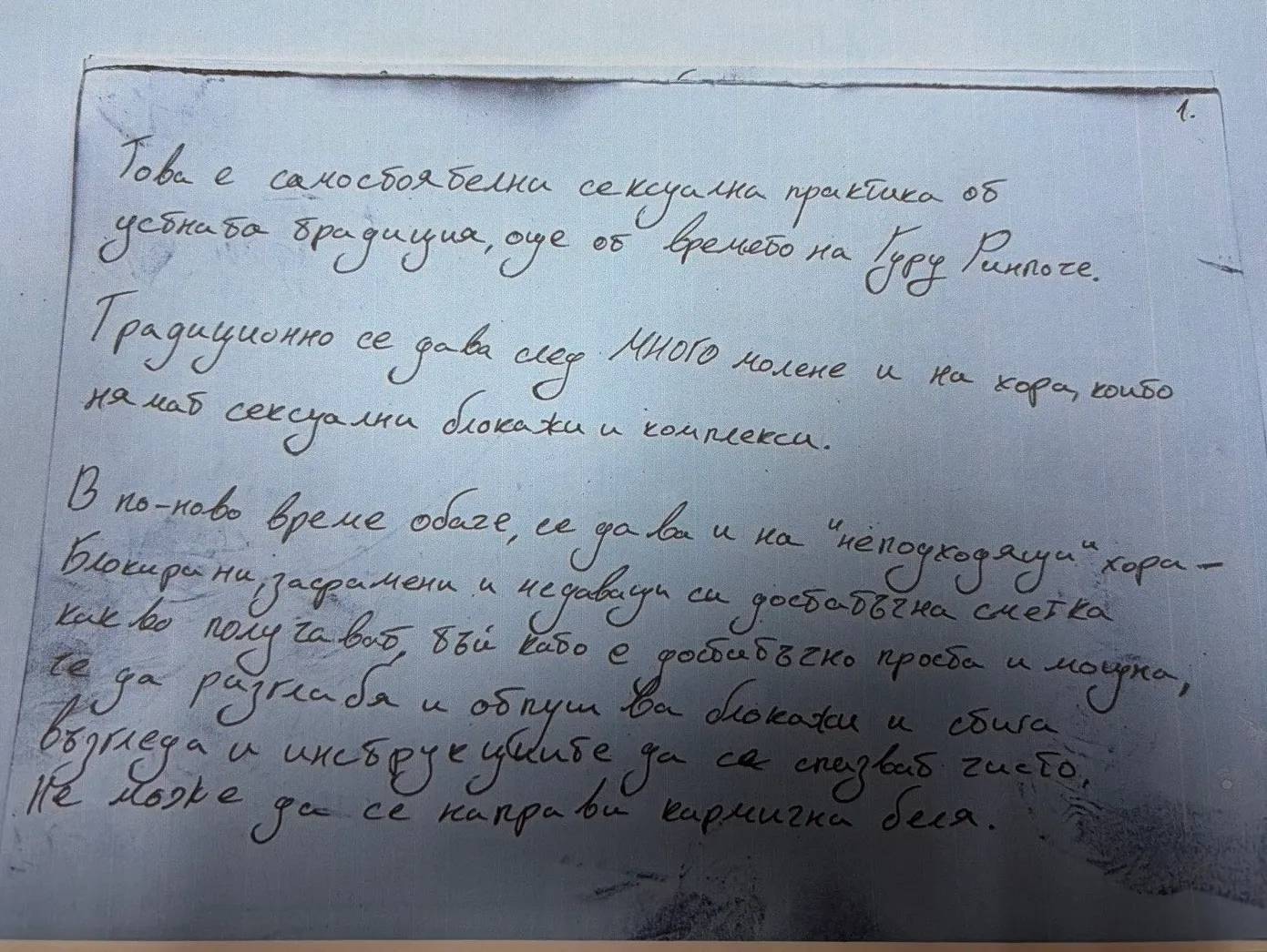 В личната обител на лама Ивайло Калушев в хижа "Петрохан" разследващите са открили подробни тайни записки за сексуалните практики на Петроханската секта, представени като "устна традиция от времето на Гуру Ринпоче", разкриха за breaking.bg високопоставени източници от МВР.