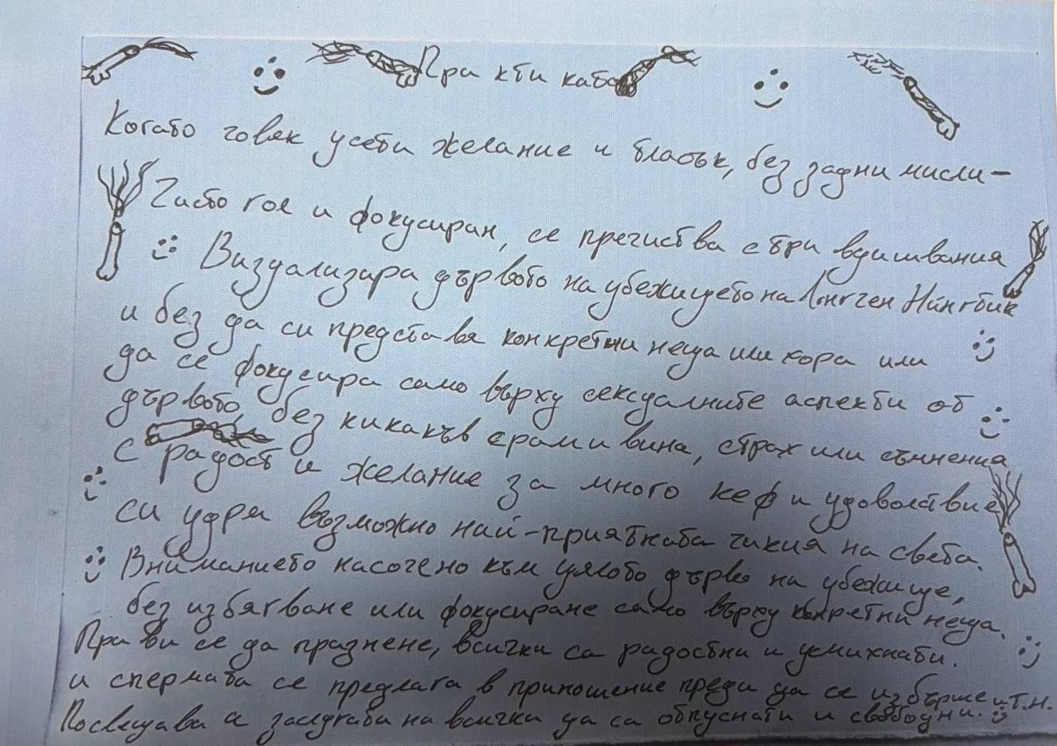 Ръката на Калушев е описала практиката, която се дава "след МНОГО молене" и се представя като "чисто злато" за "отпушване на блокажи". В реалността тя се превръща в инструмент за контрол: пълна епилация на интимни зони, анални душове, лубриканти и ритуално предлагане на спермата.