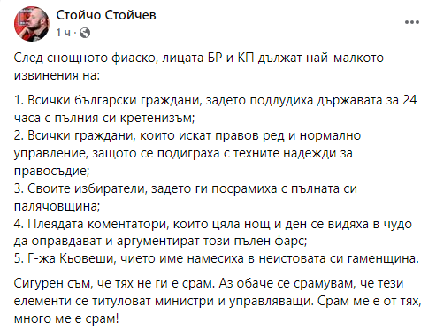 След снощното фиаско, лицата БР (Бойко Рашков - б.ред.) и КП (Кирил Петков - б.ред.) дължат най-малкото извинения на: