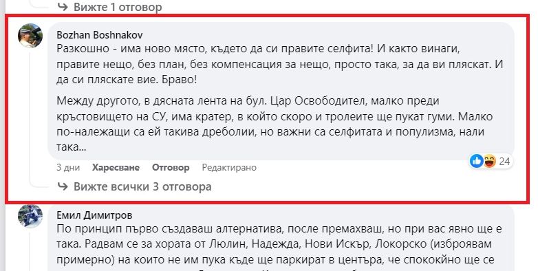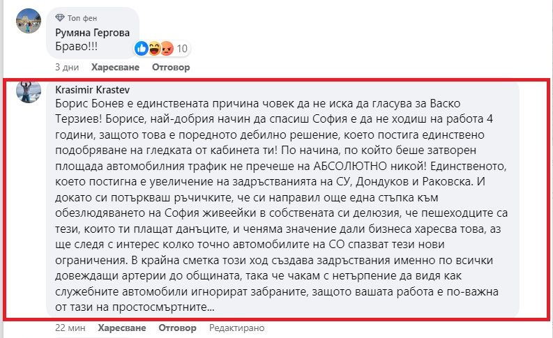 Доволен от изчегъртването на колите около "Александър Невски", Борис Бонев качи снимка в социалната мрежа, под която буквално бе пометен от гневни софиянци, несъгласни с промяната.