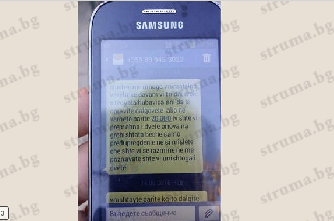 Ето и текста на изпратения есемес: "Слушай ме много внимателно Веске, давам ви три дни срок твоята хубавица Ани да си оправи дълговете, ако не ми върнете 20 000 лева, онова с гробищата е само предупреждение, не си мислете, че ще ви се размине, ще ви унищожа и двете."