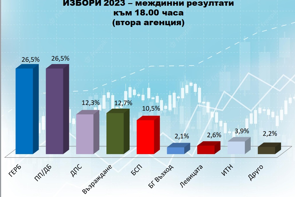 Втори екзит пол на друга социологическа агенция към 18.00 часа дава пълно равенство между ГЕРБ и ПП-ДБ - по 26,5% за двете партии.