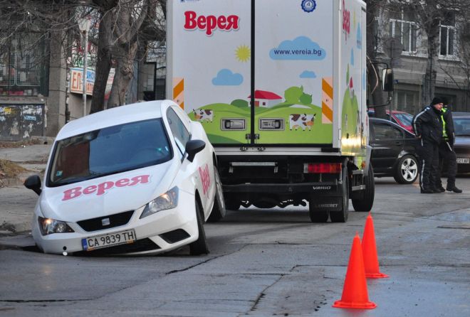 Лек автомобил пропадна в дупка на улица "Мармарлийска" във Велико Търново.