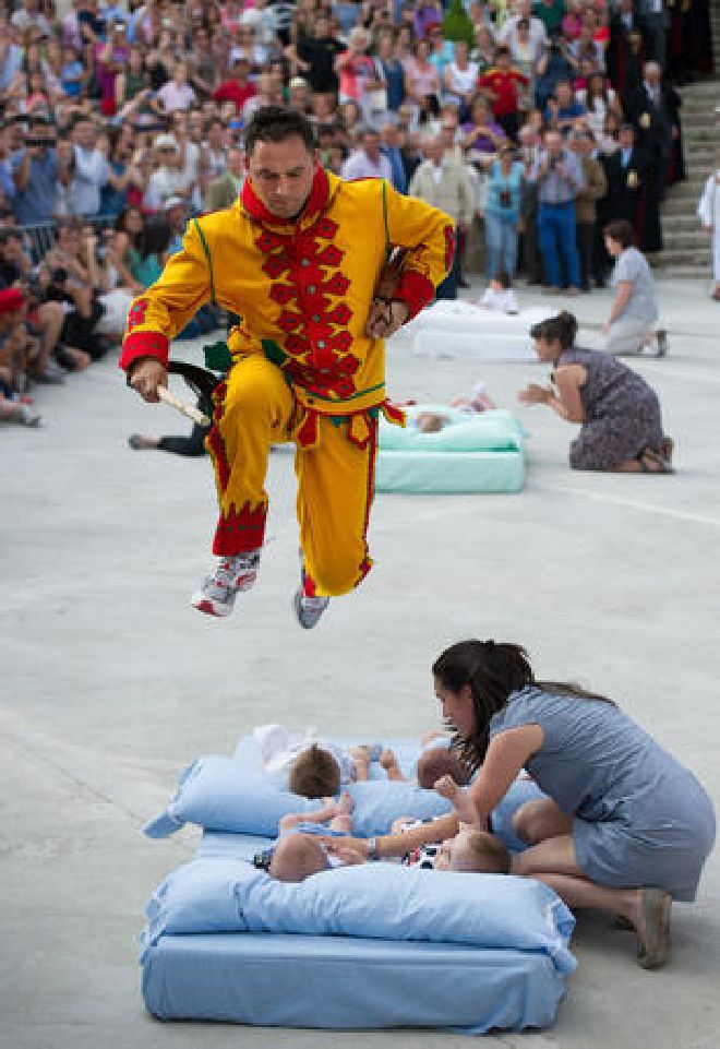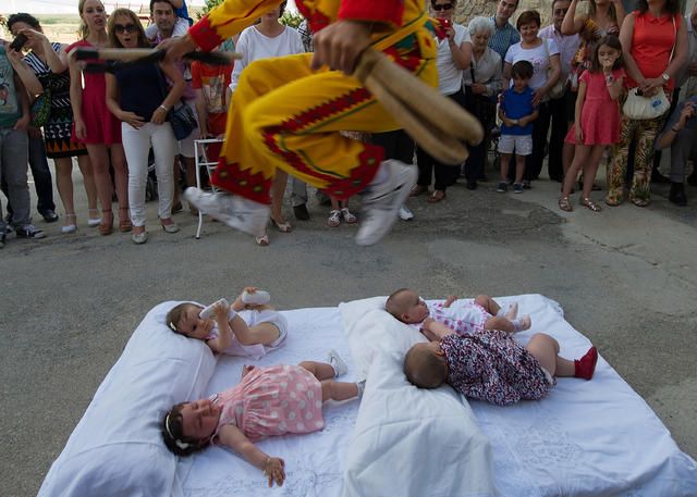 В близкото до град Бургос испанско село Кастрийо де Мурсия се проведе поредното издание на прочутия Фестивал по прескачане на бебета от преоблечени като дяволи мъже, пише ТВ7.