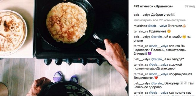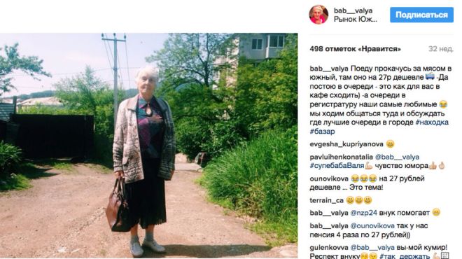 81-годишна баба от Приморския край удиви всичките си земляци, след като си направи акаунт в Инстаграм. Валентина Ивановна се подвизава в социалната мрежа с ника "Баб Валя". Модерната баба споделя свои снимки от ежедневието си: как приготвя палачинки, лежи на леглото и си почива, как отива на еди-кой си пазар "защото там месото е с 27 рубли по-евтино", как си прави селфи с внуците и пуши наргиле с тях, изпращайки лятото.