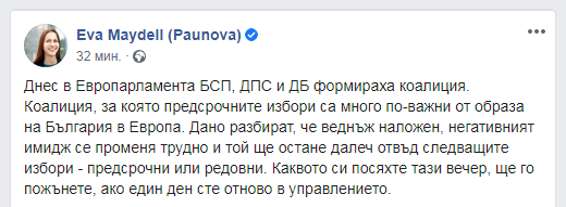 Днес в Европарламента БСП, ДПС и ДБ формираха коалиция. Коалиция, за която предсрочните избори са много по-важни от образа на България в Европа. Това коментира на страницата си във Фейсбук евродепутатът Ева Паунова-Майдел след дебатите за върховенството на закона в България.