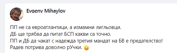 Евгений Михайлов: ПП не са евроатлантици, а измамни лигльовци. ДБ ще трябва да питат БСП какви са точно. Радев потрива доволно рУчки