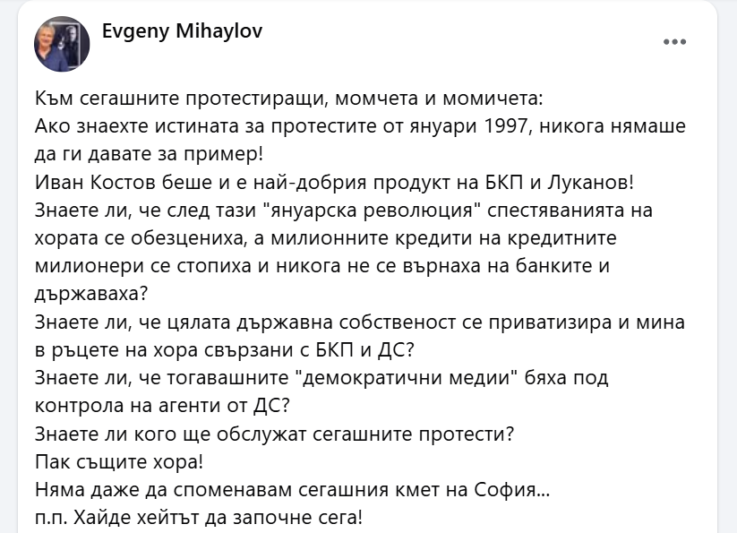 Към сегашните протестиращи, момчета и момичета: Ако знаехте истината за протестите от януари 1997, никога нямаше да ги давате за пример! Така режисьорът Евгений Михайлов коментира облъчените младежи, излезли да рутят правителството и да проправят път на "поколението Джен Зи".