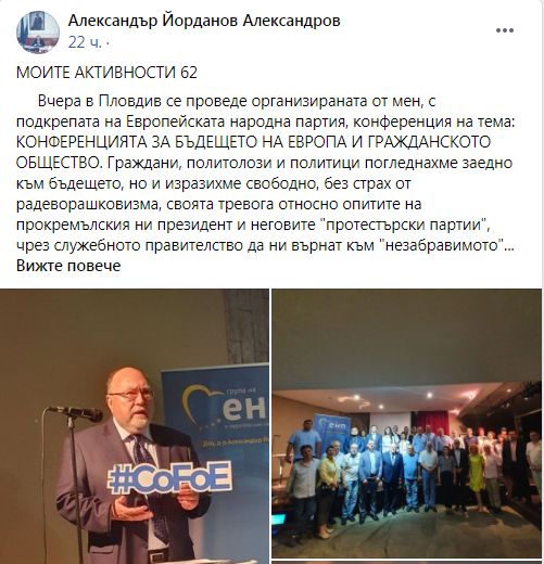 Вчера в Пловдив се проведе организираната от мен, с подкрепата на Европейската народна партия, конференция на тема: КОНФЕРЕНЦИЯТА ЗА БЪДЕЩЕТО НА ЕВРОПА И ГРАЖДАНСКОТО ОБЩЕСТВО. Граждани, политолози и политици погледнахме заедно към бъдещето, но и изразихме свободно, без страх от радеворашковизма, своята тревога относно опитите на прокремълския ни президент и неговите "протестърски партии", чрез служебното правителство да ни върнат към "незабравимото" червено минало.