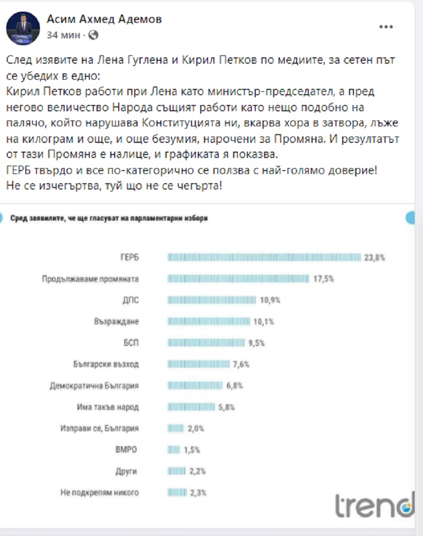 Евродепутатът Асим Адемов коментира в профила си във Фейсбук последното социологическо проучване, което дава голяма преднина на ГЕРБ пред "Продължаваме промяната".