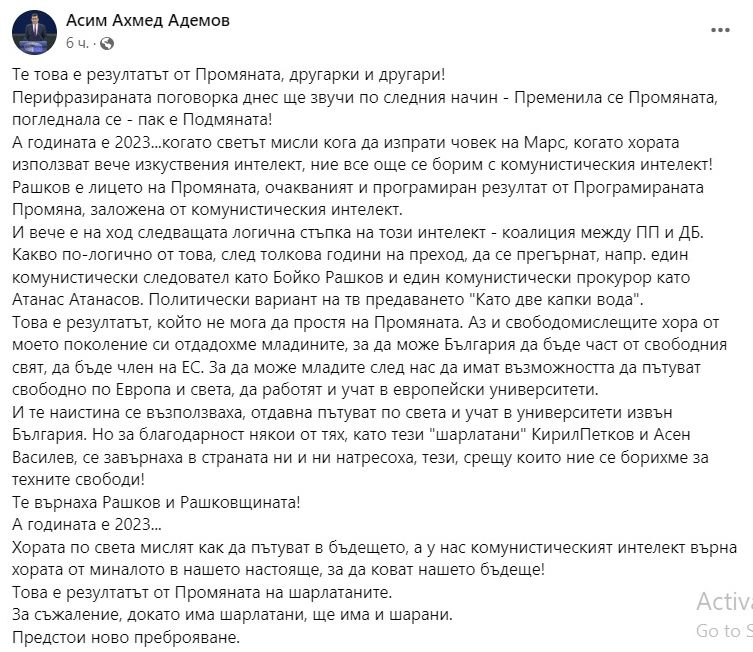 Те това е резултатът от Промяната, другарки и другари! Перифразираната поговорка днес ще звучи по следния начин - Пременила се Промяната, погледнала се - пак е Подмяната!", заяви в социалната мрежа Адемов.