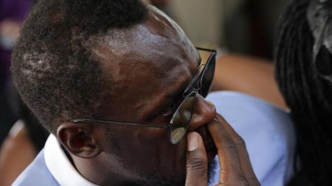 Световният рекордьор в спринта беше със слънчеви очила, но дори и зад тях се видяха сълзите, които той проливаше по време на погребението, пише "Спортал".