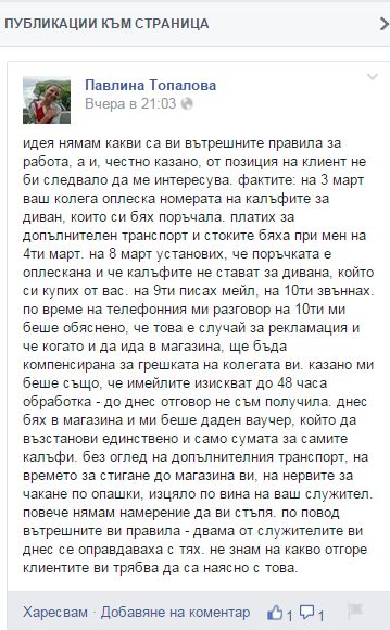 И продължава: "Казано ми беше също, че имейлите изискват до 48 часа обработка - до днес отговор не съм получила. Днес бях в магазина и ми беше даден ваучер, който да възстанови единствено и само сумата за самите калъфи. Без оглед на допълнителния транспорт, на времето за стигане до магазина ви, на нервите за чакане по опашки, изцяло по вина на ваш служител. Повече нямам намерение да ви стъпя. По повод вътрешните ви правила - двама от служителите ви днес се оправдаваха с тях. Не знам на какво отгоре клиентите ви трябва да са наясно с това."