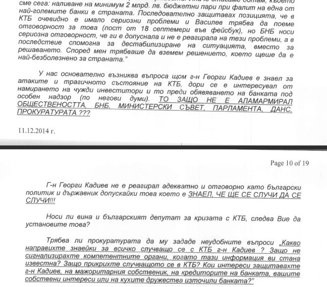 В началото на сигнала гражданите припомнят изказването на Георги Кадиев, че е имал среща с мажоритарния собственик на затворената вече Корпоративна търговска банка и цитират думите, публикувани на сайта му www.kadiev.bg.