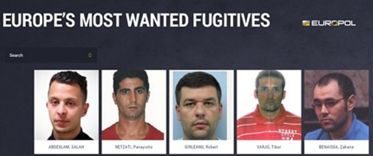 Най-издирваните престъпници в Европа със снимки и описания качи Европол в нов сайт. Там са поместени 45-те най-опасни бегълци, които властите на Стария континент търсят. На първо място е единственият оцелял след атентатите в Париж от 13 ноември и техен организатор Салах Абдеслам. Българи в списъка няма.