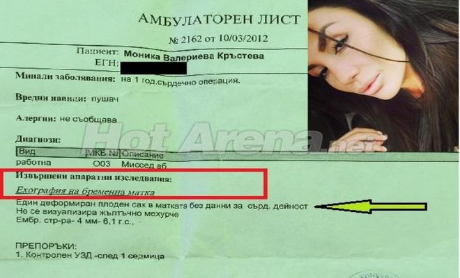 На 10 март 2012 г. Моника Валериева Кръстева е посетила дежурния гинеколог в болнично заведение в центъра на София. По време на извършената ехография на пациентката е установен деформиран плодов сак без данни за сърдечна дейност. На прост език това означава, че зародишът е спрял да се развива, което налага принудителното му отстраняване.