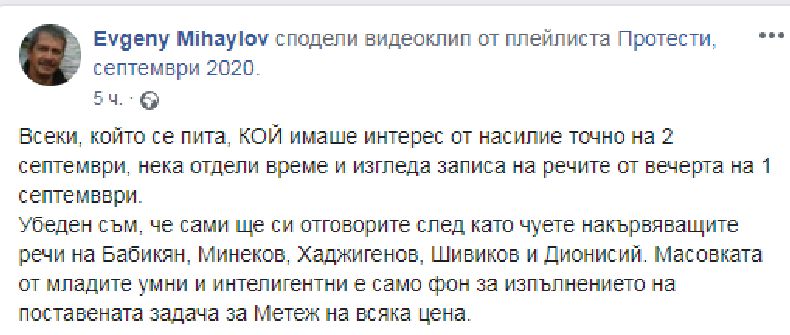 Всеки, който се пита, КОЙ имаше интерес от насилие точно на 2 септември, нека отдели време и изгледа записа на речите от вечерта на 1 септемвври, написа в профила си във "Фейсбук" режисьорът Евгений Михайлов.