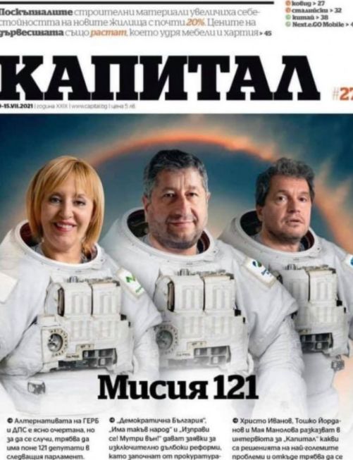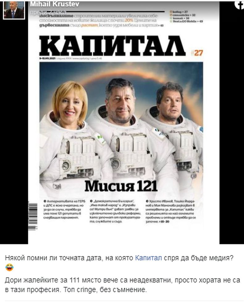 Фейсбук прегрява от смешни коментари и постове по повод новата корица на „Капитал“ - в главните роли с “астронавтите“ Мая Манолова, Христо Иванов и Тошко Йорданов.