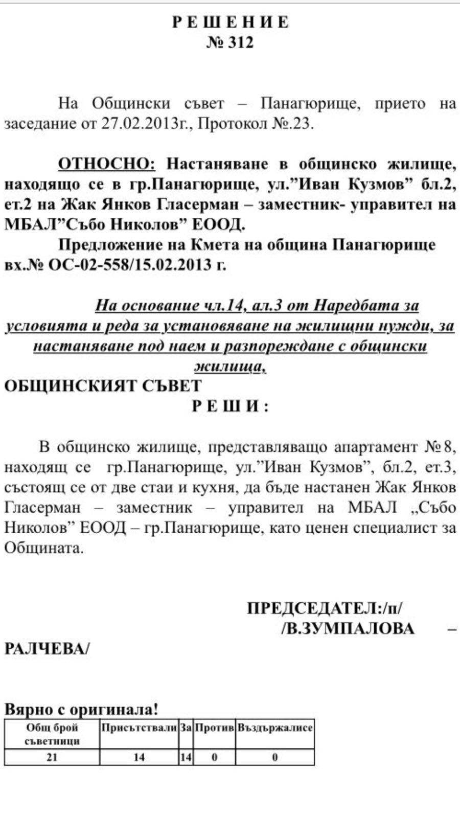 Въпросният управленец дори придобил общинско жилище в Панагюрище, където е бил зам.-директор в болницата на починалия наскоро инж. Лъчезар Цоцорков. Там охранения Гласерман отговарял за медицинското обурудване и консумативи.