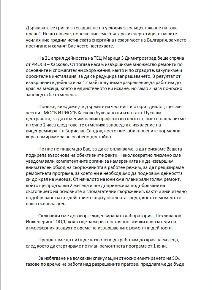 В емоционално открито писмо да Премиера енергетици от ТЕЦ МАРИЦА 3 и профсъюзите на КНСБ И КТ ПОДРЕПА в централата призовават Кирил Петков да ги подкрепи и правителството да даде възможност предприятието им да работи на минимална мощност, за да извърши планираните ремонти.