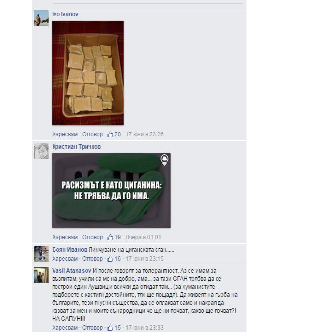 Vasil Atanasov пък пише "И после говорят за толерантност. Аз се имам за възпитам, учили са ме на добро, ама... за тази СГАН трябва да се построи един Аушвиц и всички да отидат там... (за хуманистите - подберете с кастигн достойните, тях ще пощадя). Да живеят на гърба на българите, тези гнусни същества, да се оплакват само и накрая да казват за мен и моите сънародници че ще ни почват, какво ще почват?!".