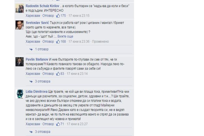 "Ще траете, че кой ще ви плаща тока, примитиви!?На чии данъци ще разчитате, за социални, детски, здравни и т.н....? Ши трайте, че ако дружно всички българи откажем да си платим тока и водата, здравните и данъците-за месец сте умреле от глад! Маймуни нееволюирали!!! Явно Дарвин като е създал теорията си, не е видял мангал- да види, че по пътя на еволюцията манго е спрял да се развива и се е заклещил м/у човека и примата!", пък казва Lidia Dimitrova.