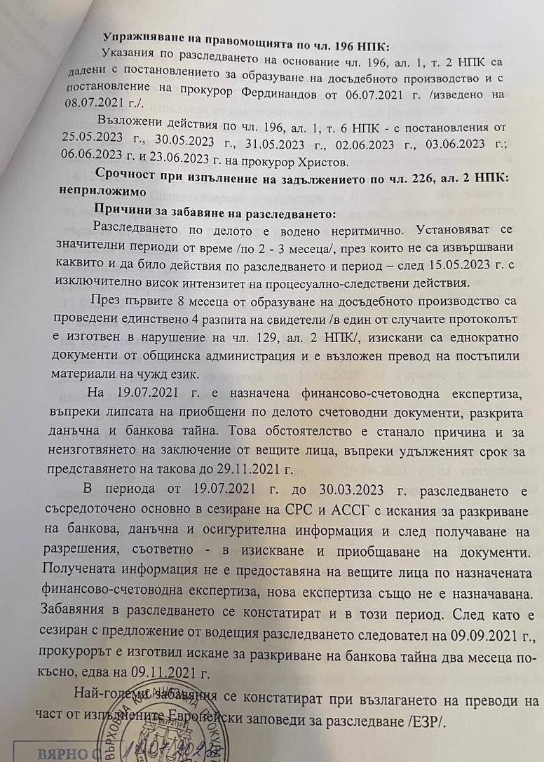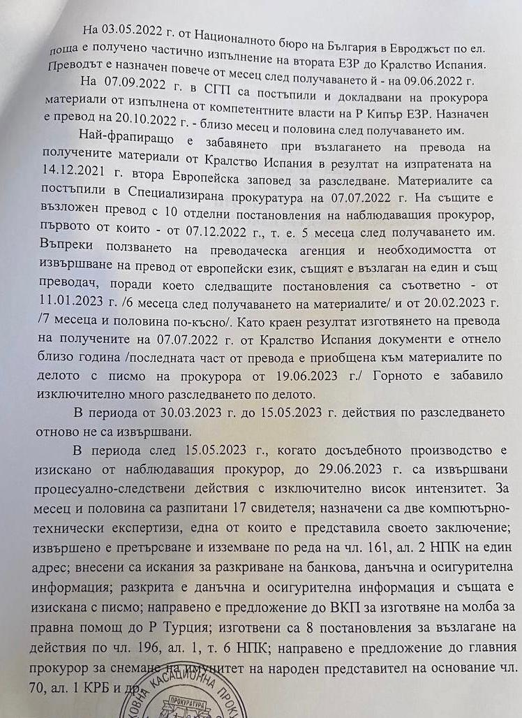 Най-фрапиращо е забавянето при възлагането на превода на получените материали от Кралство Испания в резултат на изпратената на 14.12.2022 г. втора Европейска заповед за разследване. Материалите са постъпили в Специализирана прокуратура на 07.07.2022г. На същите е възложен превод с 10 отделни постановления на наблюдаващия прокурор, първото от които - от 07.12.2022 г., т. е. 5 месеца след получаването им. Въпреки ползването на преводаческа агенция и необходимостта от извършване на превод от европейски език, същият е възлаган на един и същ преводач, поради което следващите постановления са съответно - от 11.01.2023 г. /6 месеца след получаването на материалите/ и от 20.02.2023 г. /7 месеца и половина по-късно/. Като краен резултат изготвянето на превода на получените на 07.07.2022 г. от Кралство Испания документи е отнело близо година /последната част от превода е приобщена към материалите по делото с писмо на прокурора от 19.06.2023 г./ Горното е забавило изключително много разследването по делото.