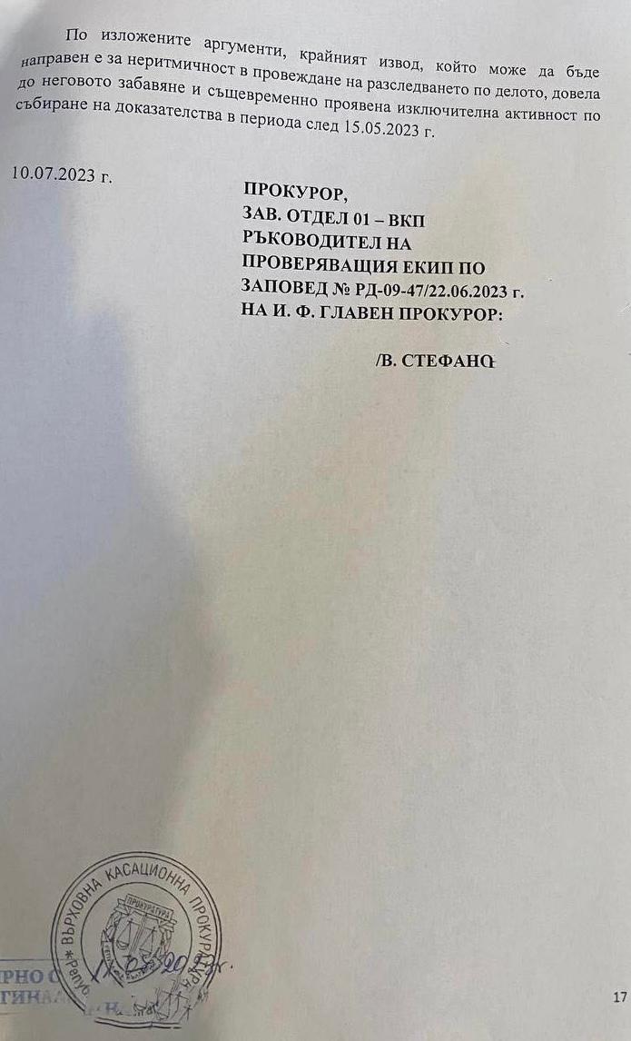 Журналистката Соня Колтуклиева се сдоби от свои източници със заключението на проверката, изготвено от прокурор В. Стефанова, завеждащ отдел във ВКП.