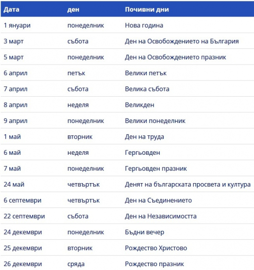 Очертават се няколко дълги почивки, за които от сега може да планирате пътувания или отпуски. Първата най-дълга почивка ни очаква през април, когато ще почиваме цели 4 дни за Великден.