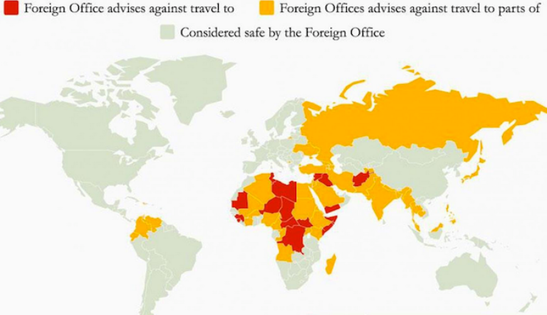 Картата показва също и 45 потенциално опасни държави, заради размирици в някои от регионите. Упоменава се областта на Северен Синай в Египет, където се разби A321. Части от Русия също са показани като опасни от правителството, включително и района в близост до границата с Украйна и площта на Чечения. Области в близост до границата с Грузия и Азербайджан - също.