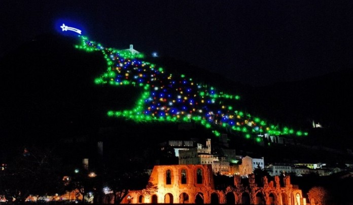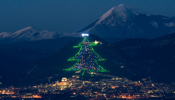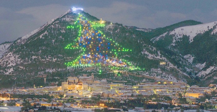 Жителите на Губио, градче в италианската област Умбрия, са големи късметлии, защото виждат своята украсената елха от всяка точка на града си. Тя се намира на хълм в планината Инджино, който е с височина повече от 650 метра.