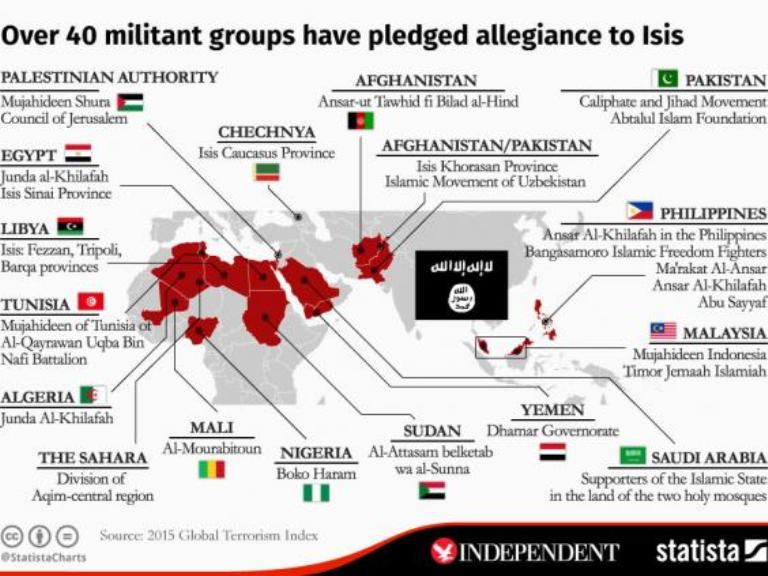 Карта показва 30 групировки, официално ангажирали се с принадлежност към терористичната групировка, и други 12 обещали подкрепата си, посочени в доклад на Индекса за глобалния тероризъм.