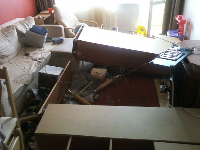 Ето какво пише той: "Здравейте! Изпращам ви няколко снимки от пораженията, които нанесе земетресението на дома ни на 19-я етаж на ул. Борба. За щастие жена ми и децата не бяха вкъщи, иначе последиците можеше да са фатални".