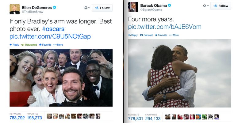 Снимката на Дедженерис измести от първото място досегашния най-популярен туит - а именно, фотосът, на който Барак Обама прегръща съпругата си Мишел, след като през 2012 г. спечели изборите за президент на САЩ за втори път. Тя е озаглавена "Още 4 години".