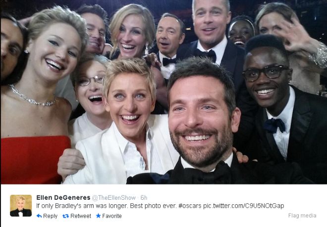 Пускайки го в Туитър, Елън Дедженерис коментира: "Само ръката на Брадли да беше по-дълга! Най-добрата снимка за всички времена!".