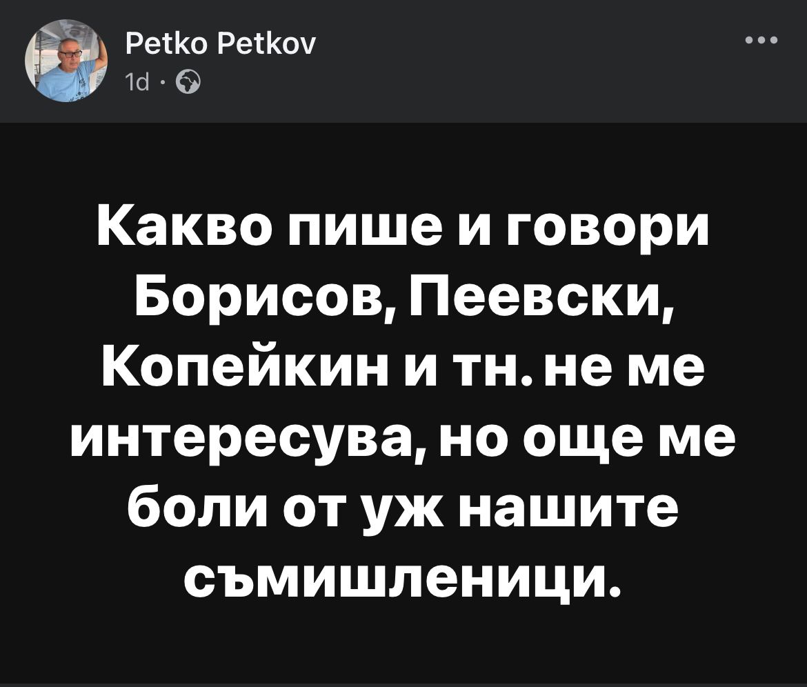 "Какво пише и говори Борисов, Пеевски, Копейкин и тн. не ме интересува, но ещо ме боли от уж нашите съмишленици".