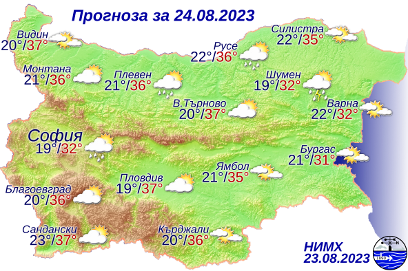 Времето ще се задържи предимно слънчево, а превалявания и гръмотевици се очакват в планинските райони и в Източна България. Максималните температури ще са между 32° и 37°, за София около 32°.