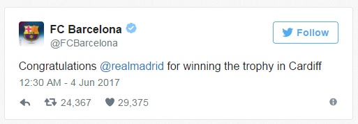 "Белите" спечелиха по категоричен начин финала, побеждавайки Ювентус с 4:1. Реал стана и първият отбор, който успява да защити трофея си в Шампионската лига. Така Реал приключи по мечтан начин сезона, в който надделя над Барселона в битката за шампионската титла в Испания. Именно феновете на каталунците преглътнаха най-трудно снощния успех на вечния съперник. Това обаче не попречи на клуба да поздрави големия си конкурент с вчерашния успех. Официалният акаунт на Барселона снощи поздрави Реал за спечеления трофей, демонстрирайки истински феърплей.