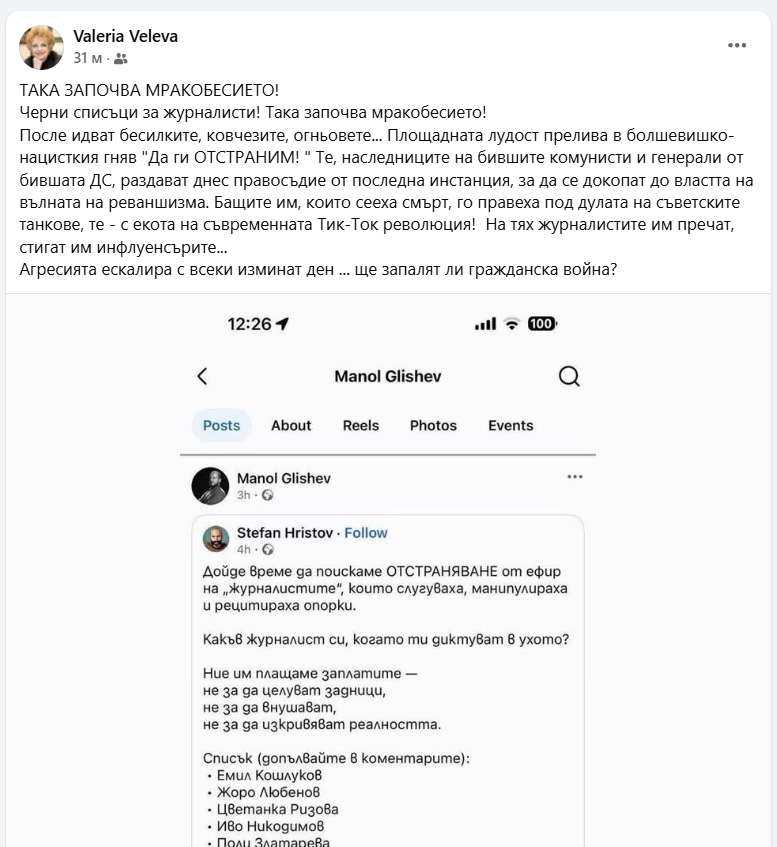 "Черни списъци за журналисти! Така започва мракобесието! После идват бесилките, ковчезите, огньовете... Площадната лудост прелива в болшевишко-нацисткия гняв "Да ги ОТСТРАНИМ!". Те, наследниците на бившите комунисти и генерали от бившата ДС, раздават днес правосъдие от последна инстанция, за да се докопат до властта на вълната на реваншизма. Бащите им, които сееха смърт, го правеха под дулата на съветските танкове, те - с екота на съвременната Тик-Ток революция! На тях журналистите им пречат, стигат им инфлуенсърите...", коментира журналистката и издател на "Епицентър" Валери Валева.