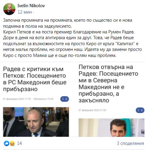"Това, че Радев беше подхлъзнат за възможностите на просто Киро от кръга "Капитал" е негов малък проблем, но огромен наш." Това написа в профила си във "Фейсбук" журналистът Ивелин Николов. Поводът е разломът, който лъсна днес между президента и премиера, след техни изказвания. "Посещението в Северна Македония беше придързано", каза Радев. По-късно Петков му отвърна задочно: "Не е прибързано, а ужасно много закъсняло".