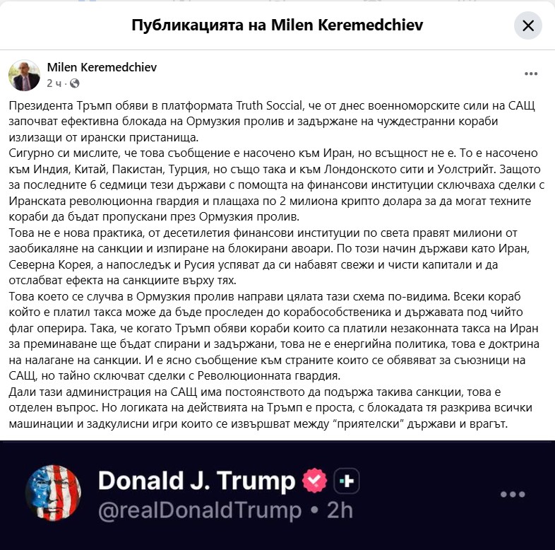 Сигурно си мислите, че това съобщение е насочено към Иран, но всъщност не е. То е насочено към Индия, Китай, Пакистан, Турция, но също така и към Лондонското сити и Уолстрийт. Това коментира Мелен Керемедчиев, политически анализатор, на страницата си във Фейсбук.