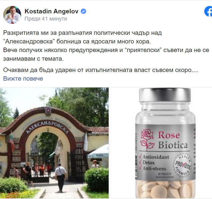 Вместо незабавни действия по изнесените от мен данни за корупционни схеми и финансови нередности в “Александровска” болница, държавата в лицето на МЗ, започва активно търсене на компромати срещу мен. Жалко и долно мероприятие, обречено на провал. Разкритията ми обаче ще продължат. Съвсем скоро ще разберете каква е връзката между един апетитен терен (болничен комплекс) в идеалния център на София, розовото масло и пробиотиците.