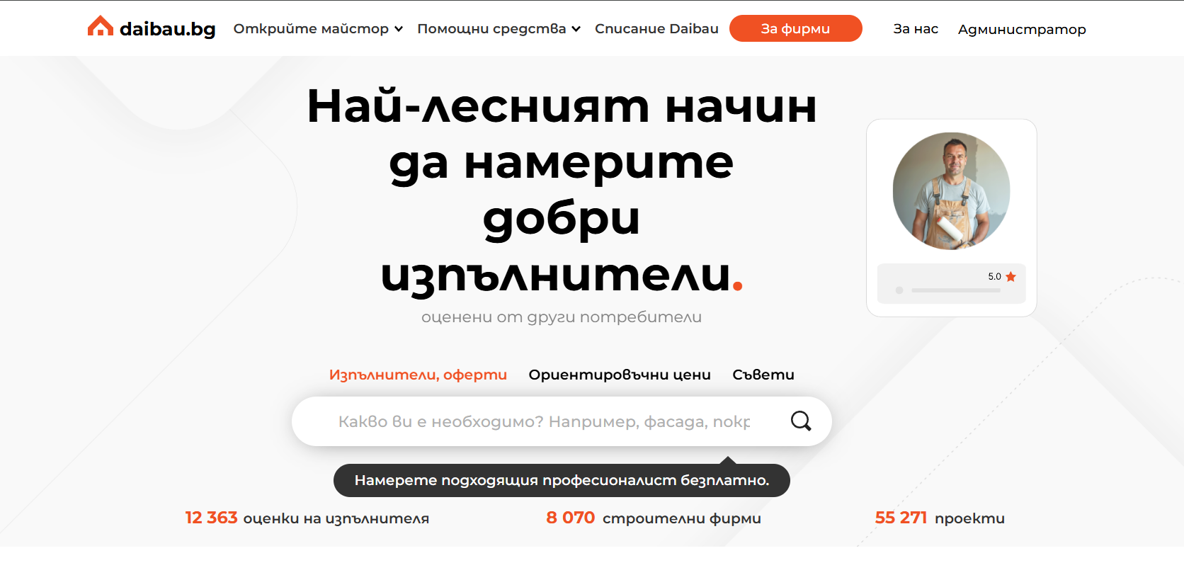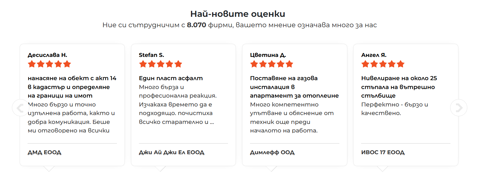 В платформата са регистрирани над 8 000 строителни предприятия и майстори от цяла България. В профила на всеки от тях могат да се видят: оценки от предишни клиенти, коментари, снимки на завършени проекти. Всичко е видимо!