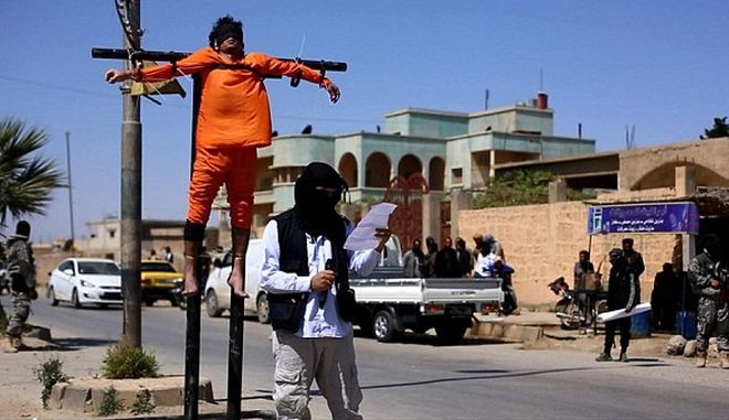 Преди да бъде прикован на кръста, единият от обречените е буквално пребит с ритници от джихадистите. „Този човек и неговият спътник ни предадоха- те са уши и очи на американците”, обръща се мъж, соблечен в бяло, към множеството. След това лично изритва няколко пъти клетника.