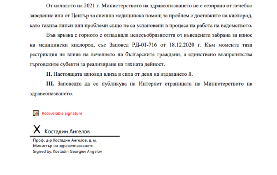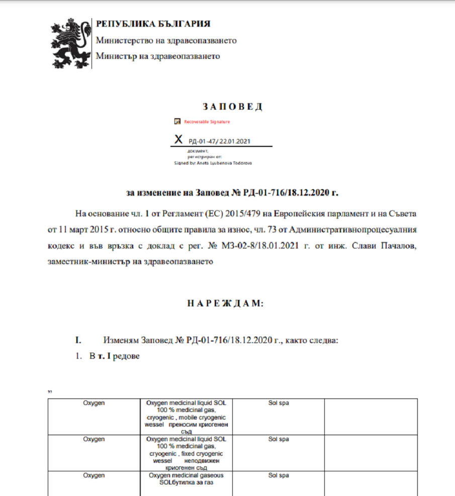 Здравният министър разпореди: Отпада забраната за износ на медицински кислород (ЗАПОВЕД)