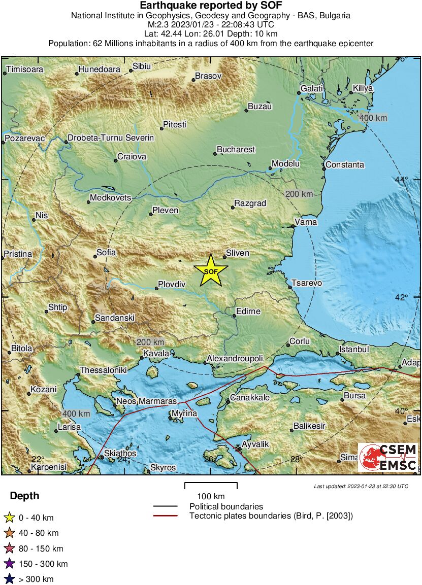 Земетресение с магнитуд 2,3 по скалата на Рихтер е регистрирано на територията на България, съобщава Европейско-средиземноморски сеизмологичен център.