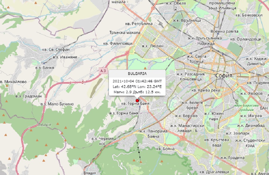 Земетресение с магнитуд от 2,9 е било регистрирано в София тази сутрин, показват данните на Националния институт по геофизика, геодезия и география на БАН.