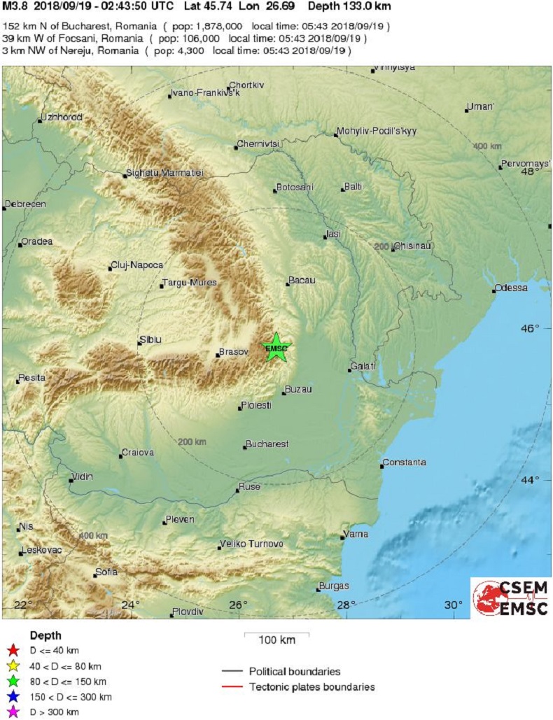 В сеизмичния район Вранча в Румъния е регистрирано земетресение с магнитуд 3,8 по Рихтер, показват данни на Европейския сеизмологичен център.
