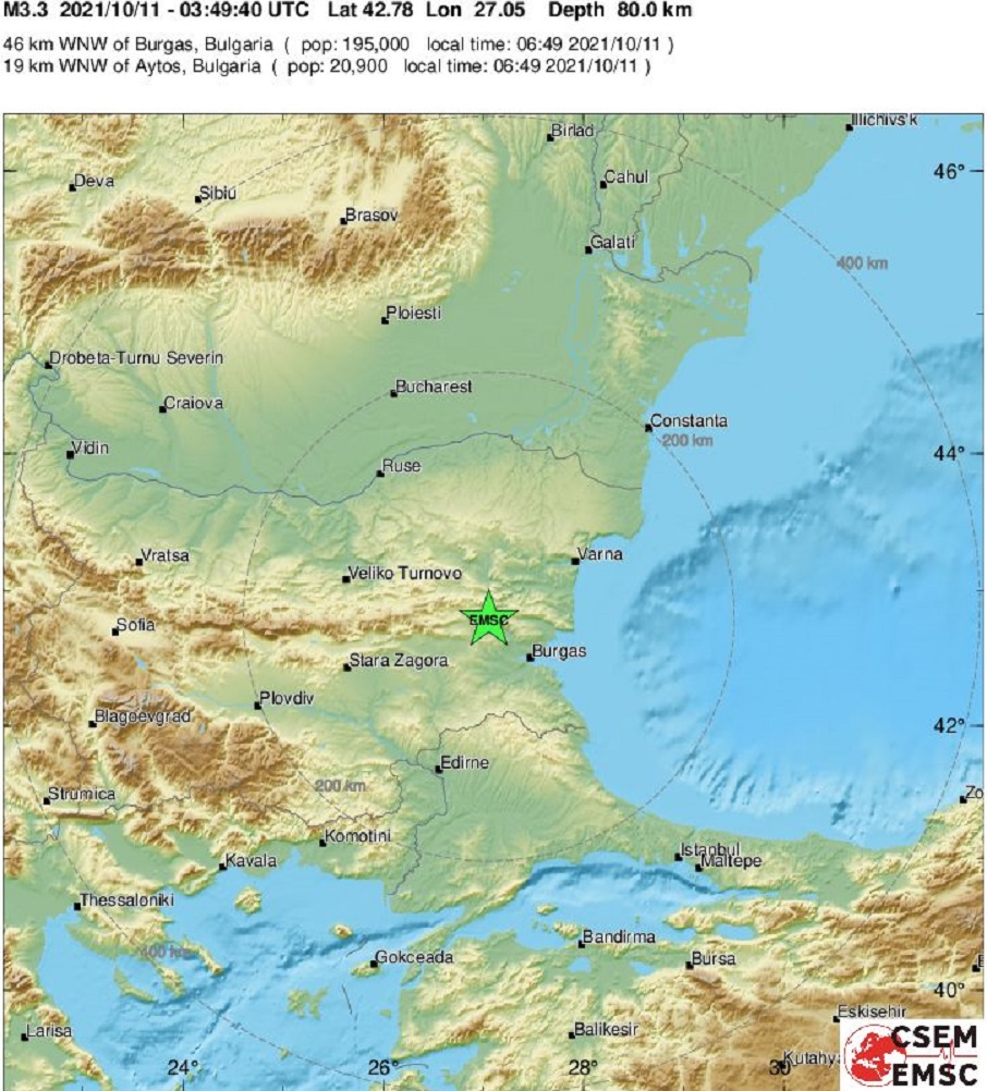 По първоначална информация трусът е регистриран малко преди 7 часа тази сутрин. Епицентърът е на 19 км. от Айтос и на 46 от Бургас. Дълбочината на земетресението е 80 км.