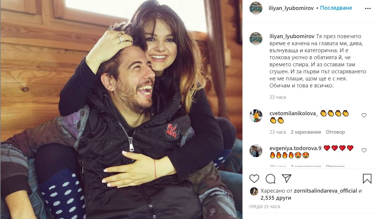 "Тя през повечето време е качена на главата ми, дива, вълнуваща и категорична. И е толкова уютно в обятията й, че времето спира. И аз оставам сгушен там. И за пръв път остаряването не ме плаши, щом е с нея. Обичам и това е всичко", изля поетично Любомиров душата си в Инстаграм.